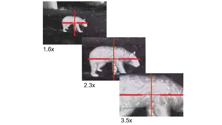 10 стрелковых профилей. 10 масштабируемых сеток. В памяти прицела можно сохранить до 10 профилей выверки. Легко подобрать оптимальную конфигурацию под любые охотничьи задачи и световые условия: в каждом профиле выставляется одна рабочая дистанция (50, 100, 200, 300 или 500 метров) и одна сетка заданного типа (10 штук), цвета (6 вариантов) и яркости (10 уровней). Поскольку при смене увеличения все сетки масштабируются аналогично меткам дневных прицелов в I фокальной плоскости, угловые значения элементов будут постоянными, а процесс выверки — быстрым и безошибочным.